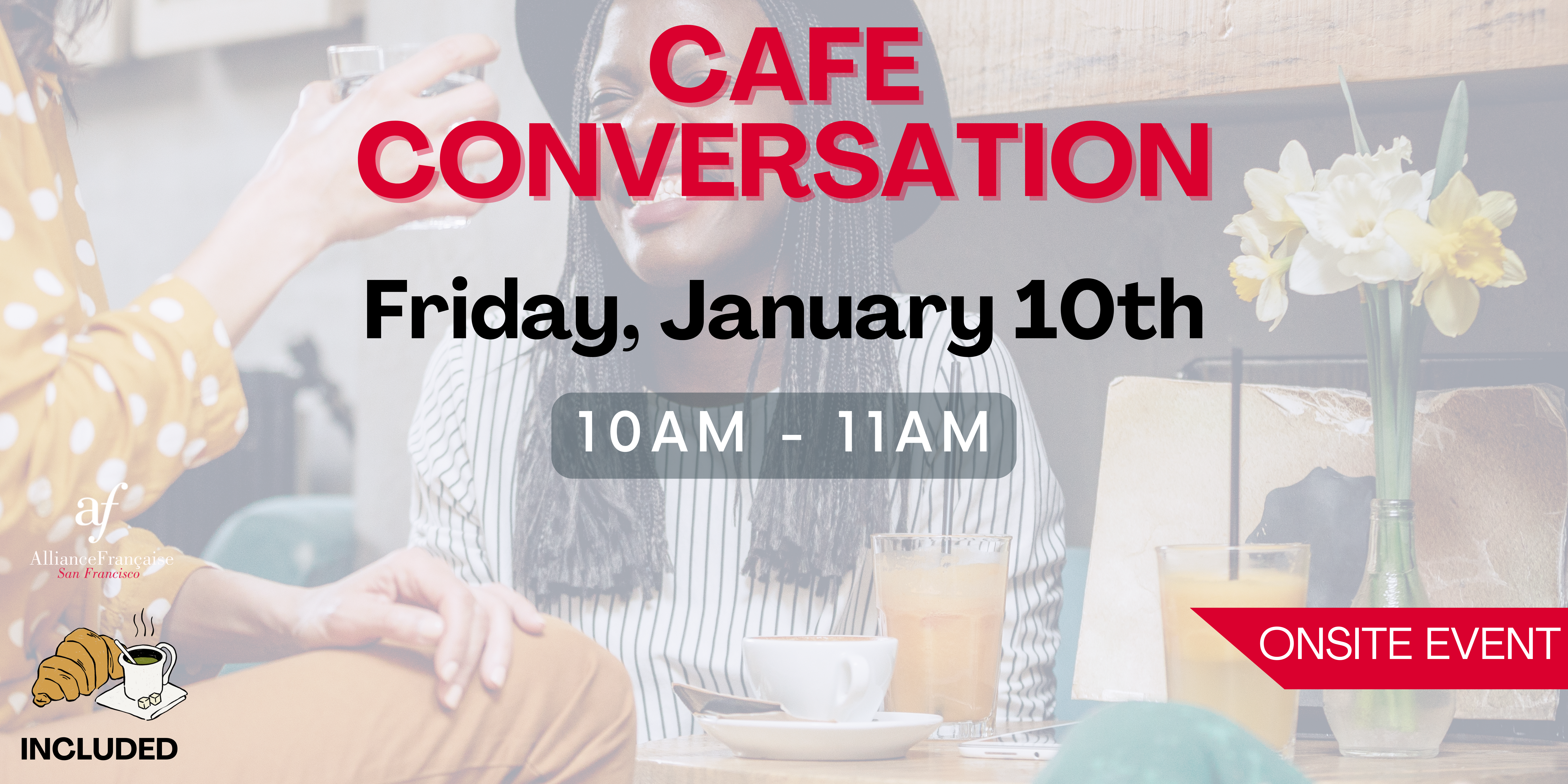 Every other Friday from 10:00am to 11:00am, let's meet in-person at the Alliance Francaise, to chat about a specific theme in French while sharing a cup of coffee or tea and a croissant.